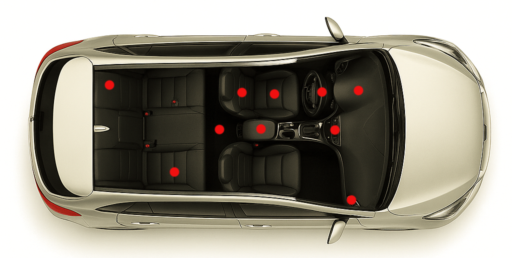 بخشهای مناسب استفاده از صفرشوی داخلی خودرو با رنگ قرمز در تصویر مشخص شده است.